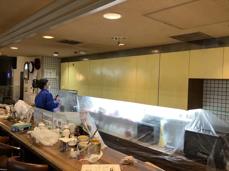 昨晩は、お店が終わってからステーションNビル2F『喫茶P.S.』さんに乗り込み、先ずはペンキ作業からスタート!