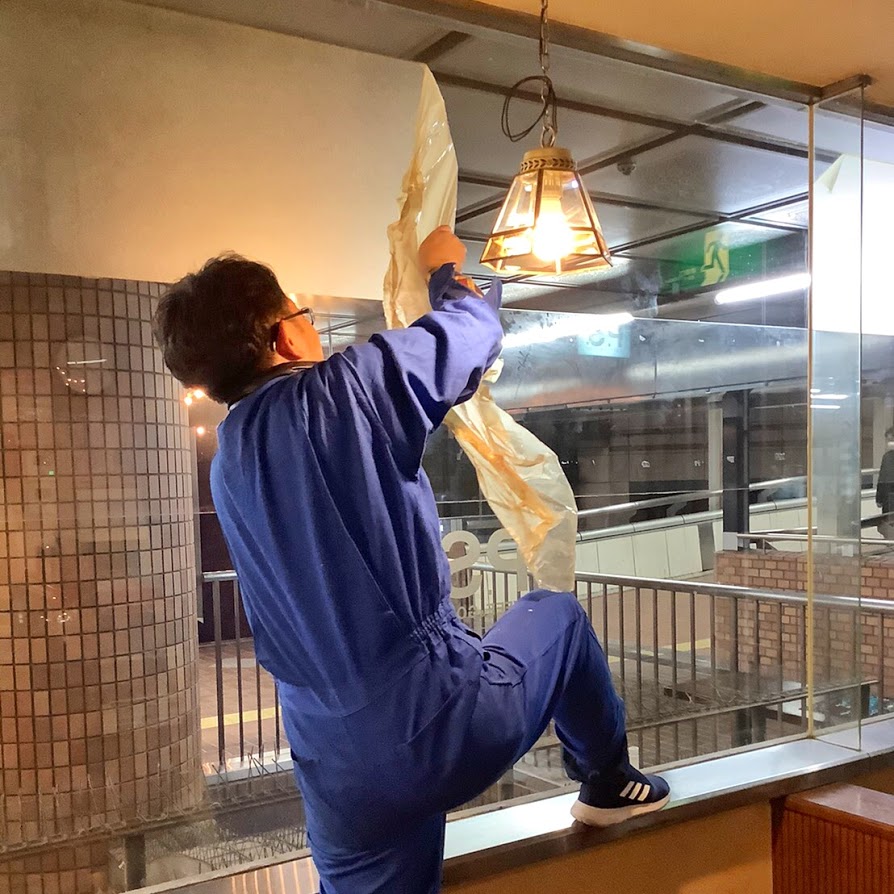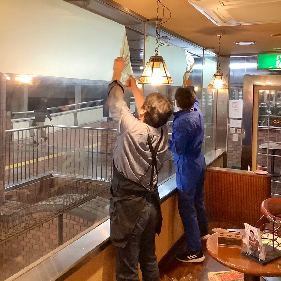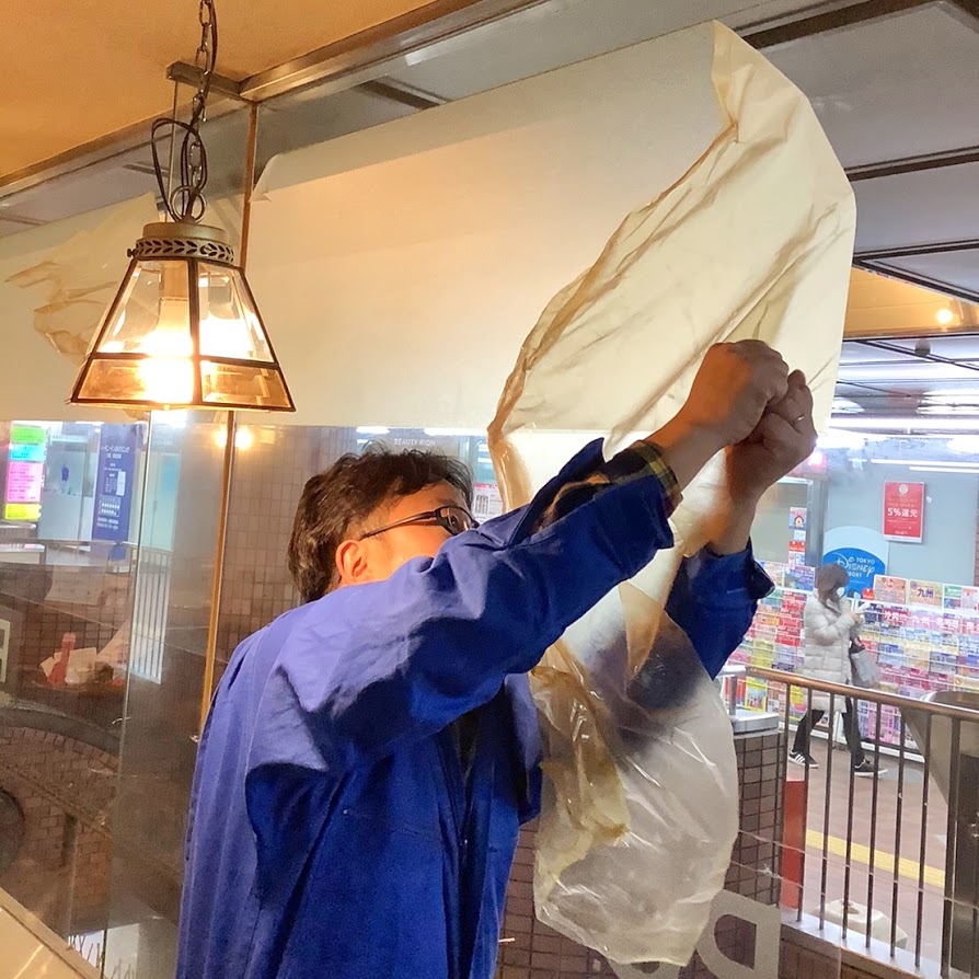 マスターと一緒にタバコで汚れたカッティングシートを剥がします。