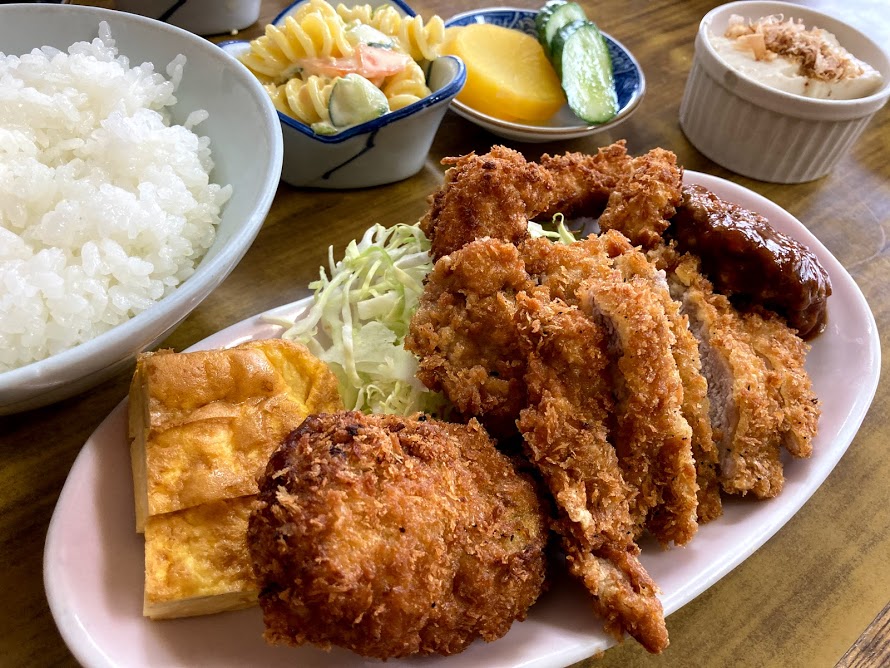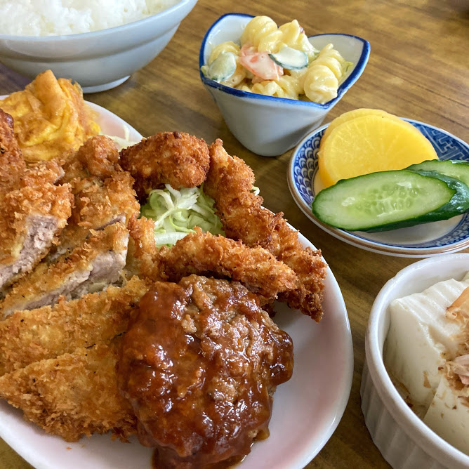 おかずはコロッケに卵焼きに牛カツ、鶏揚げ、ハンバーグと盛りだくさん!