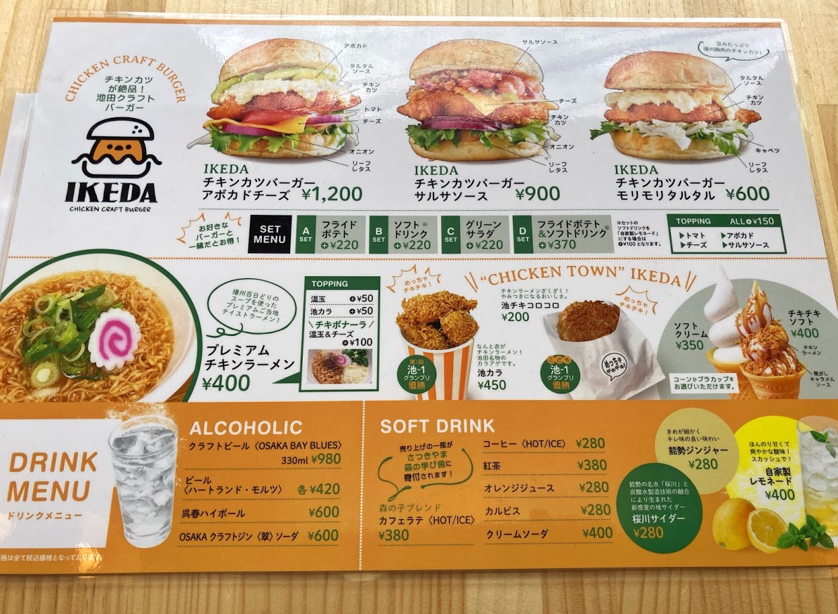 メニューはハンバーガーだけではなく、池田名物「チキンラーメン」をふんだんに取り入れたフードメニューもいろいろあります。